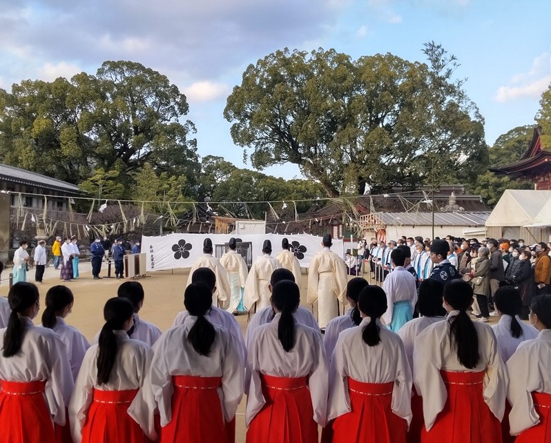 大祓式(おおはらえしき)は、6月30日の夏越の大祓と12月31日の年越の大祓の年二回執り行われます。年越の大祓は、一年の後半を終え、新年を迎えるに当たって半年の生活の罪穢(つみけがれ)を祓い清めて、新たな気持ちで新年を迎える神事です。