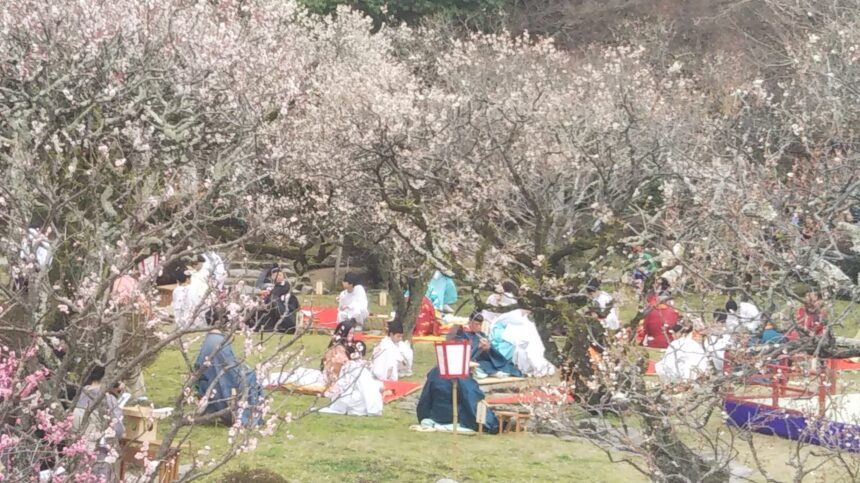 咲き誇る梅の木の下で行われる華やかな行事です。